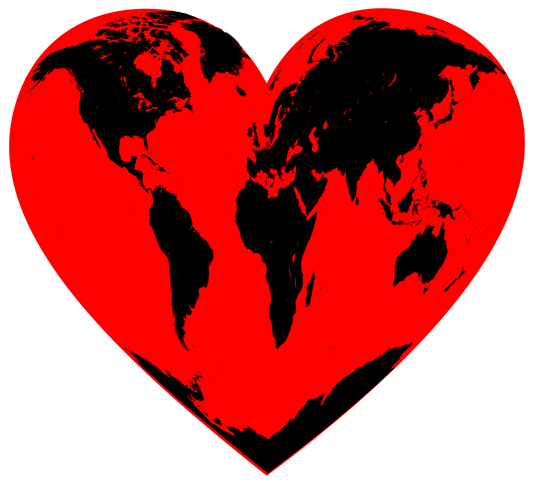 This features a large, red heart-shaped design that covers the entirety of the globe. This unique and creative representation of the world is made up of two distinct sections: one half of the heart is located on top of the other half, creating an interesting visual effect. The heart shape is filled with various countries, showcasing their locations around the globe. The design effectively combines a symbol of love with the geographical layout of our planet, making it a striking and memorable image.