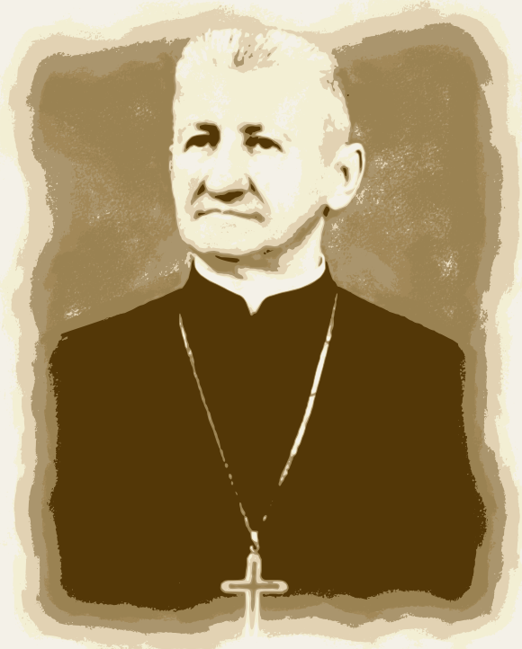 This is a black and white photograph of an older man wearing a priest's robes. He has a stern look on his face, possibly indicating that he is a religious figure or leader. The photo appears to be vintage, giving it a sense of history and importance. The man is dressed in all black, with a cross around his neck, further emphasizing his role as a priest.