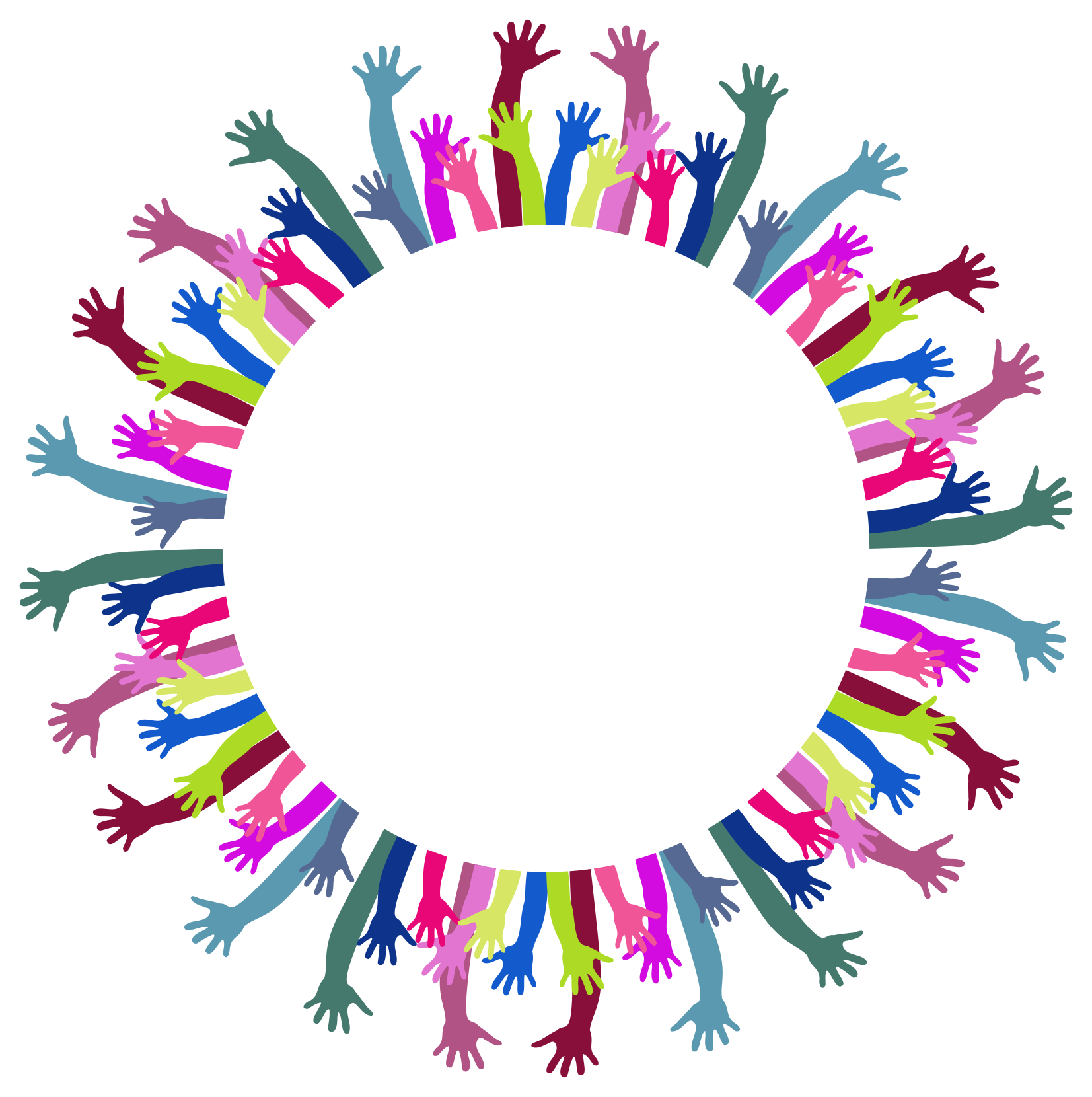This features a large circle made up of many hands, all reaching out towards the center. There are at least 13 distinct hands visible in the circle, each with varying colors and positions. Some hands are closer to the edge of the circle while others are more centrally located. The arrangement creates an interesting visual effect that resembles a group of people standing together or reaching for something. This unique composition can be interpreted as a symbol of unity, collaboration, or even a representation of human connection.