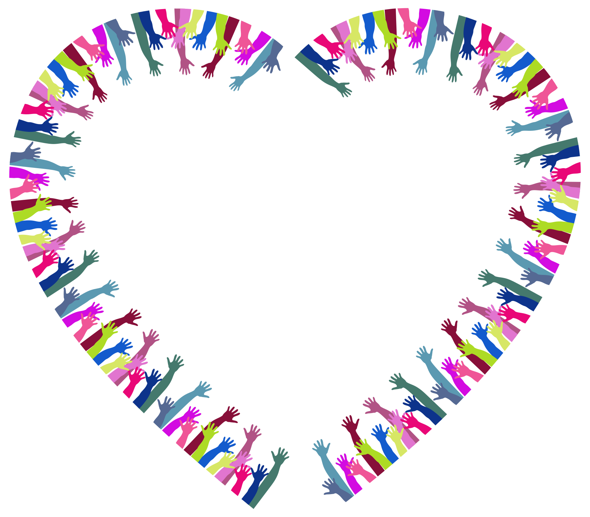 This features a large, colorful heart made up of many hands. Each hand is positioned in various directions and sizes, creating an intricate pattern that fills the entire heart shape. The hands are arranged in such a way that they appear to be reaching out from all sides, giving the impression of a loving embrace or connection between people. This unique design showcases the importance of human interaction and unity through the use of simple yet powerful visual elements.