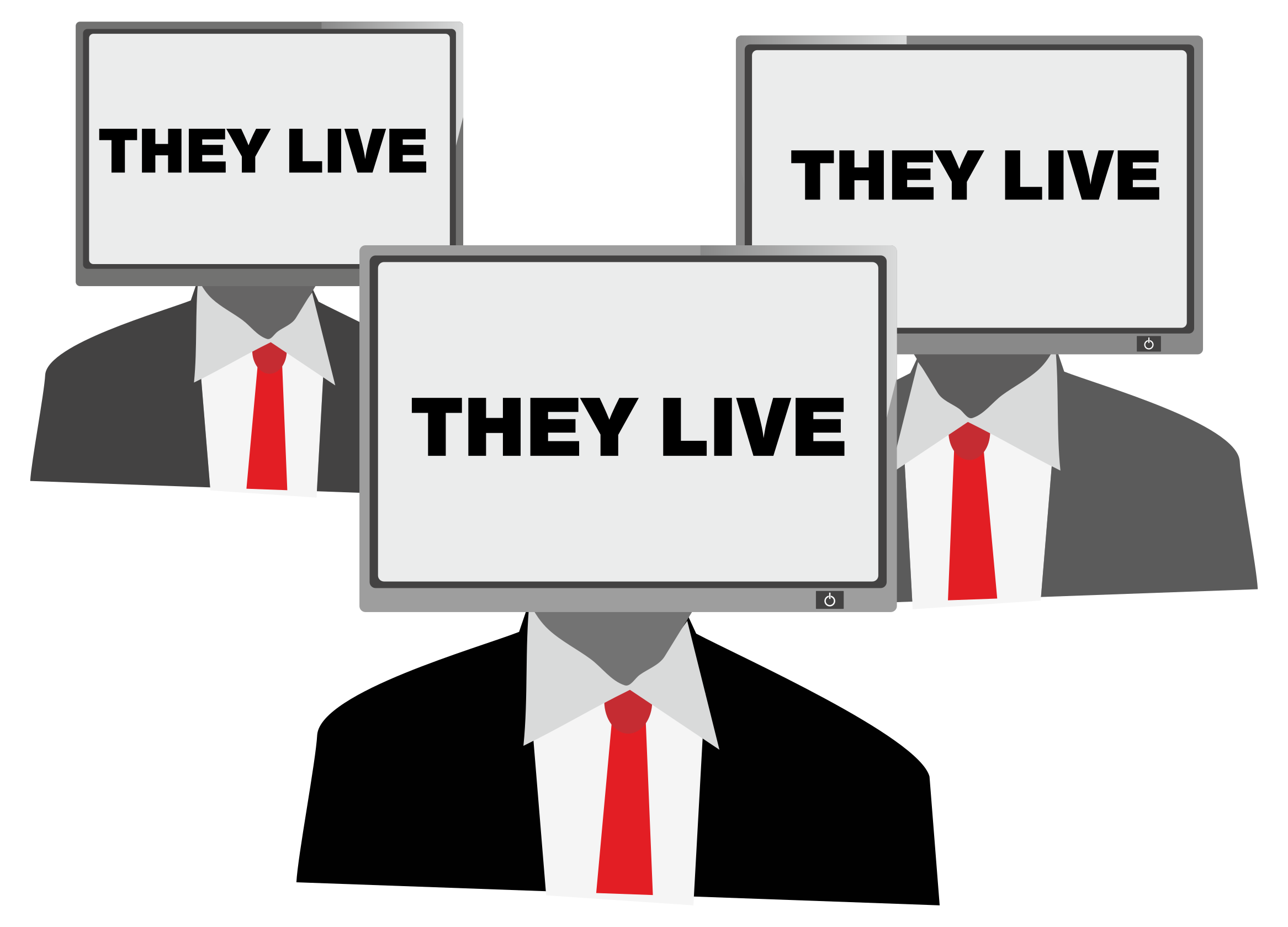 This features four different pictures of men wearing suits and ties, each with a TV screen placed over their heads. The TV screens display the words "They Live" in bold white letters. This artistic arrangement creates an interesting visual effect that combines the faces of the men with the message from the television show. The images are positioned at various angles, giving the impression of depth and perspective to the scene. Overall, it is a creative representation of the iconic phrase "They Live" through the use of multiple photos and TV screens.