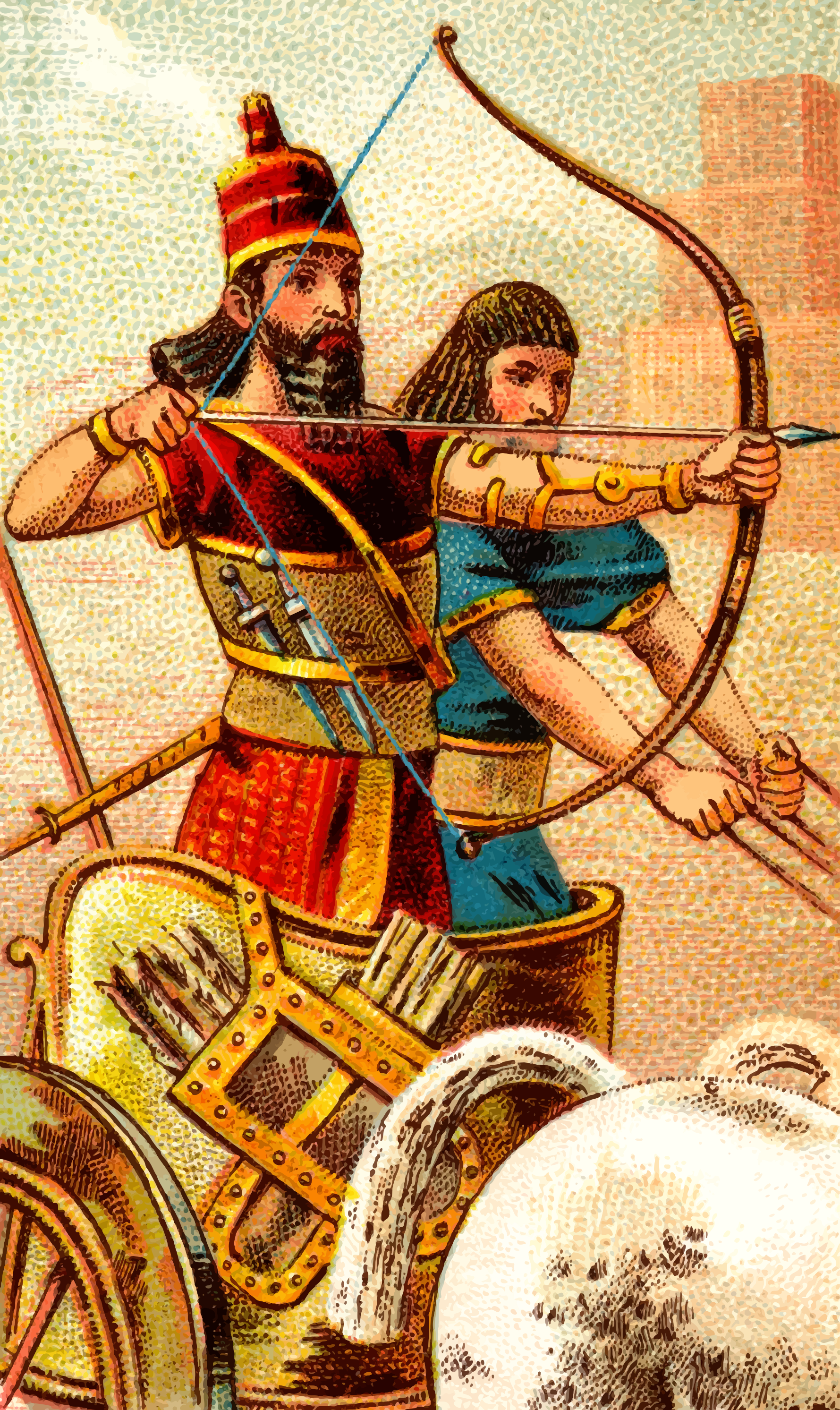 This features a man and woman dressed in ancient Greek attire, holding bows and arrows. They appear to be depicted as warriors or hunters from an earlier time period. The man is positioned on the left side of the scene while the woman stands next to him on the right. Both individuals are focused on their respective targets, showcasing their skills in archery. The image also includes a horse, which can be seen towards the bottom-left corner of the picture. This adds an element of movement and action to the scene, further emphasizing the historical context of the characters' roles as warriors or hunters.