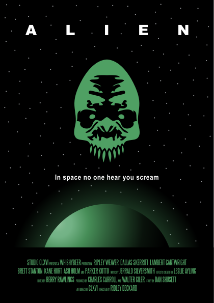 The poster is for the movie Alien, which features a green alien head with a skull on it. The poster has a space theme and is set against a backdrop of stars. The text "In Space No One Hears You Scream" is written in bold letters at the bottom of the poster. The cast members are listed below the title, including Sigourney Weaver, Tom Skerritt, Veronica Cartwright, Harry Dean Stanton, John Hurt, Ian Holm and Yaphet Kotto.