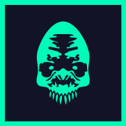 This features a blue and green skull with an evil appearance. It has a large, open mouth that appears to be ready for action or attacking something. The skull is the main focus of the image, taking up most of the frame. The colors used in this design are predominantly blue and green, creating a striking contrast against the black background. This unique and creepy skull logo could be associated with various themes such as horror or fantasy, depending on its context.