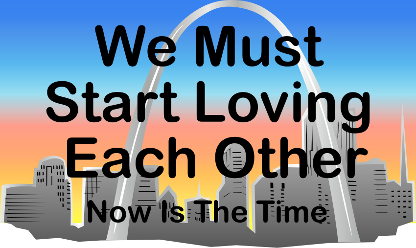 This features a cityscape with the Gateway Arch as its main attraction. Above the arch, there is an inspiring message that reads "We must start loving each other now." This message is displayed in white text on a blue background, which contrasts nicely with the vibrant colors of the city skyline. The image conveys a sense of unity and encourages people to come together and appreciate their surroundings.