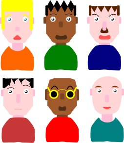 This features a collection of six different colored men's heads, each wearing unique shirts and displaying various hairstyles. They are all positioned in the same frame, showcasing their distinct appearances. Each man has a different skin tone, adding to the diversity of the group. The background is white, providing a clean and uncluttered backdrop for these colorful characters.