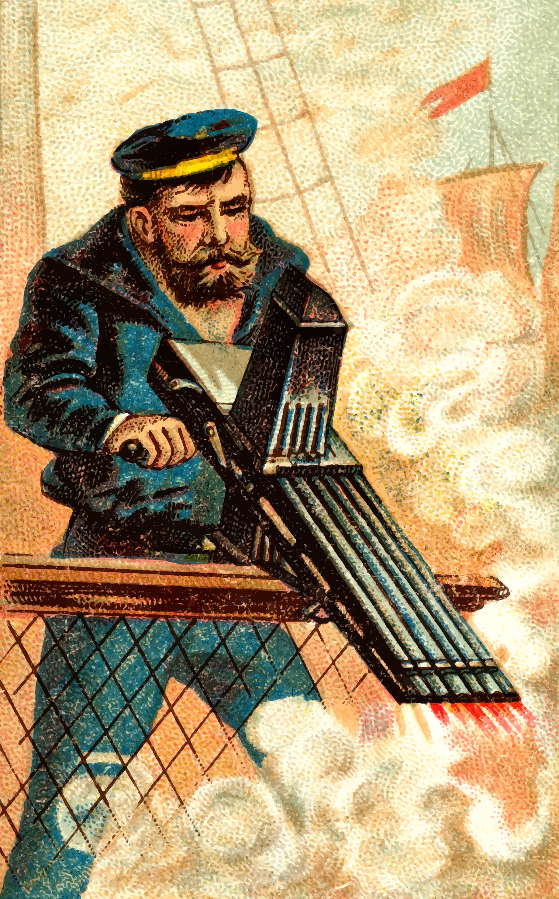This features a man dressed in a sailor's uniform, standing on the deck of a ship. He is holding a large gun or cannon, possibly preparing to fire it. The scene appears to be from an old-fashioned time period, as indicated by the man's attire and the overall design of the image. The man seems focused and determined, ready for action on the high seas.