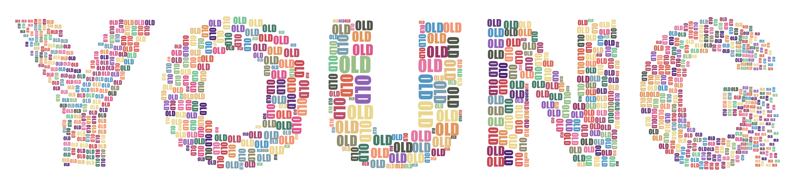 This features a large, colorful collage of various words and phrases arranged in an artistic manner. These words are organized to spell out the word "YOUNG" on top of a white background. The collage is made up of numerous individual letters, each one distinctly placed within the composition. This creative arrangement showcases the artist's skill in combining different elements into a cohesive and visually appealing piece.