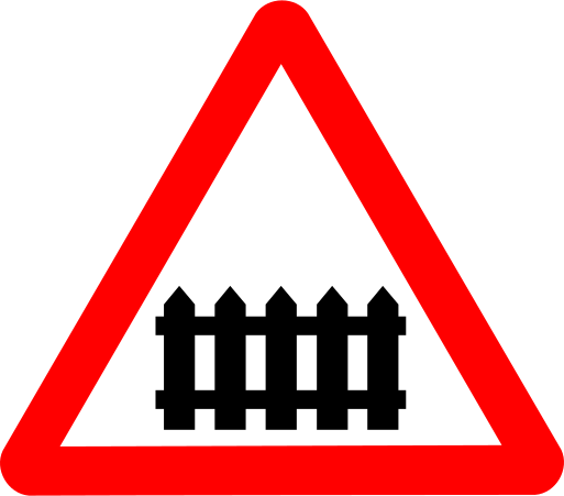 This features a red and white sign with an illustration of a fence on it. The fence is depicted as having four posts, each with a black bar across them. This sign could be used to indicate the presence of a gate or a restricted area that requires permission to enter. The design of the sign is simple yet effective in conveying its message.