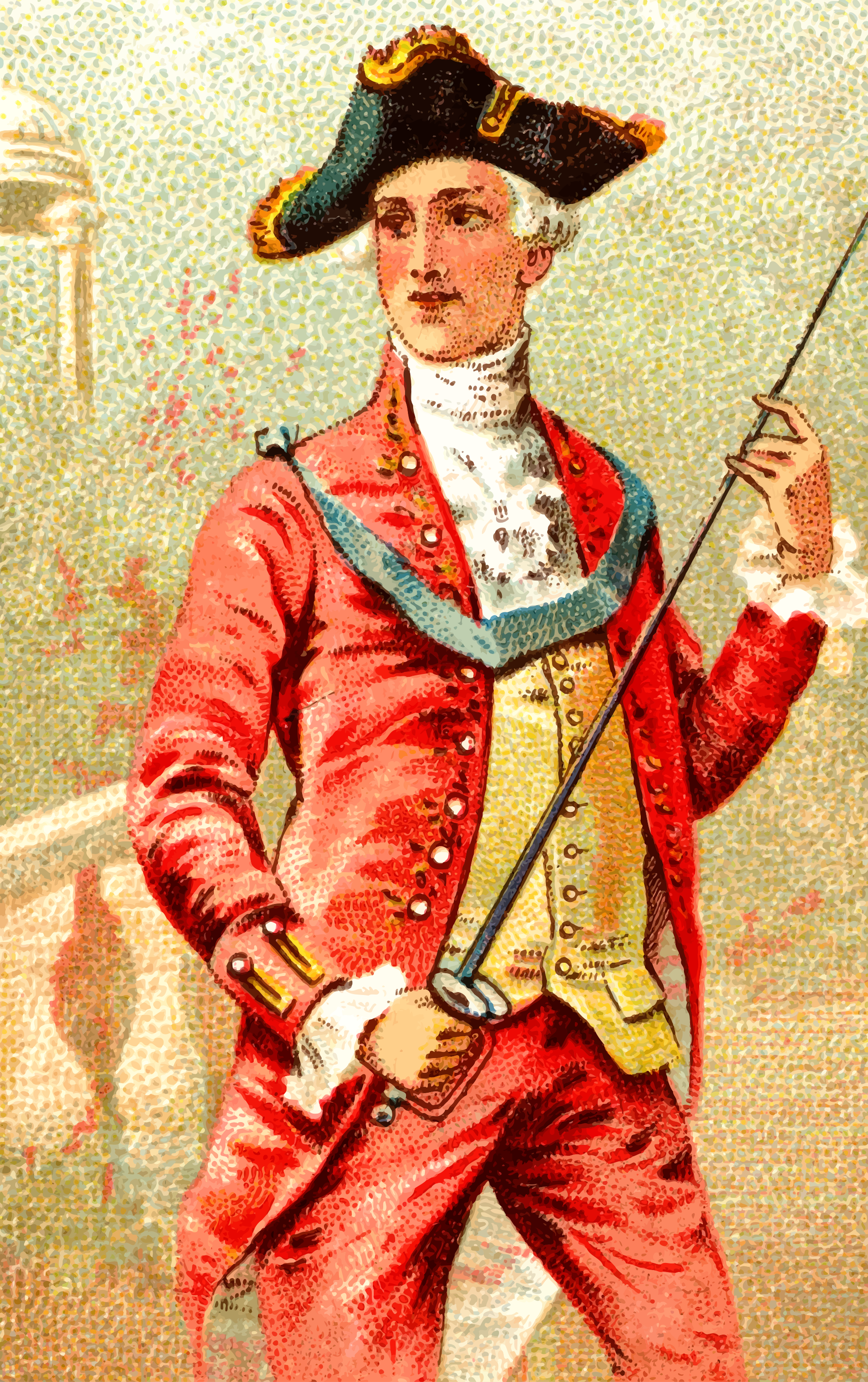This features a man dressed in red and white clothing, holding a sword. He is wearing a hat with a feather on it, giving him an air of sophistication and elegance. The man appears to be posing for the camera, possibly as part of a historical or vintage photograph. The overall atmosphere suggests that this could be a portrait from a bygone era, capturing the essence of a time when such attire was commonplace.