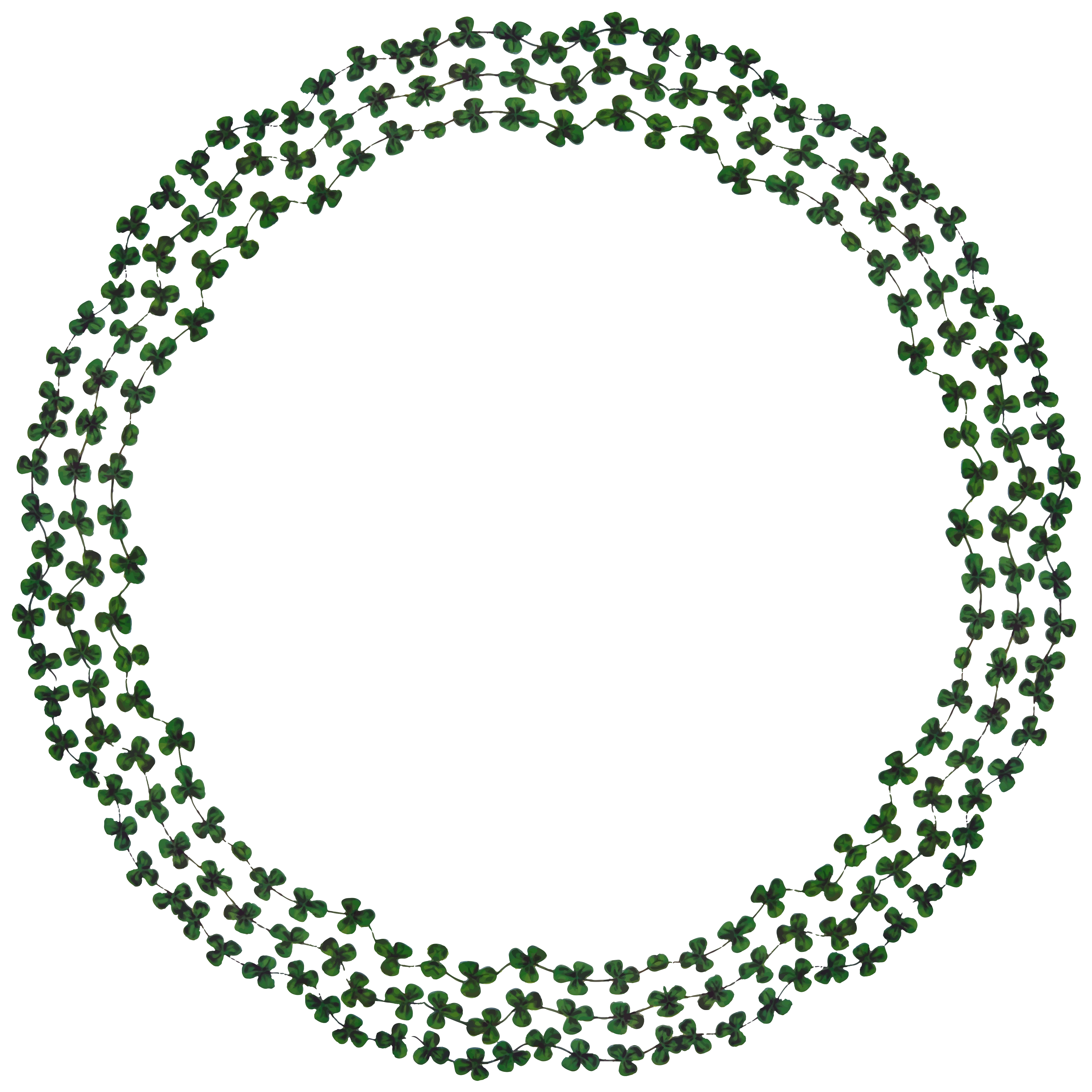 This features a circular frame with no content inside of it. Instead, the frame is made out of small clovers that have three leaves each. These clovers are arranged in such a way that they form a complete circle around the frame's perimeter. The green color of the clovers creates an appealing and natural look for the overall design. This unique circular arrangement showcases the creativity behind this artistic piece, making it stand out as a distinctive decoration or display.