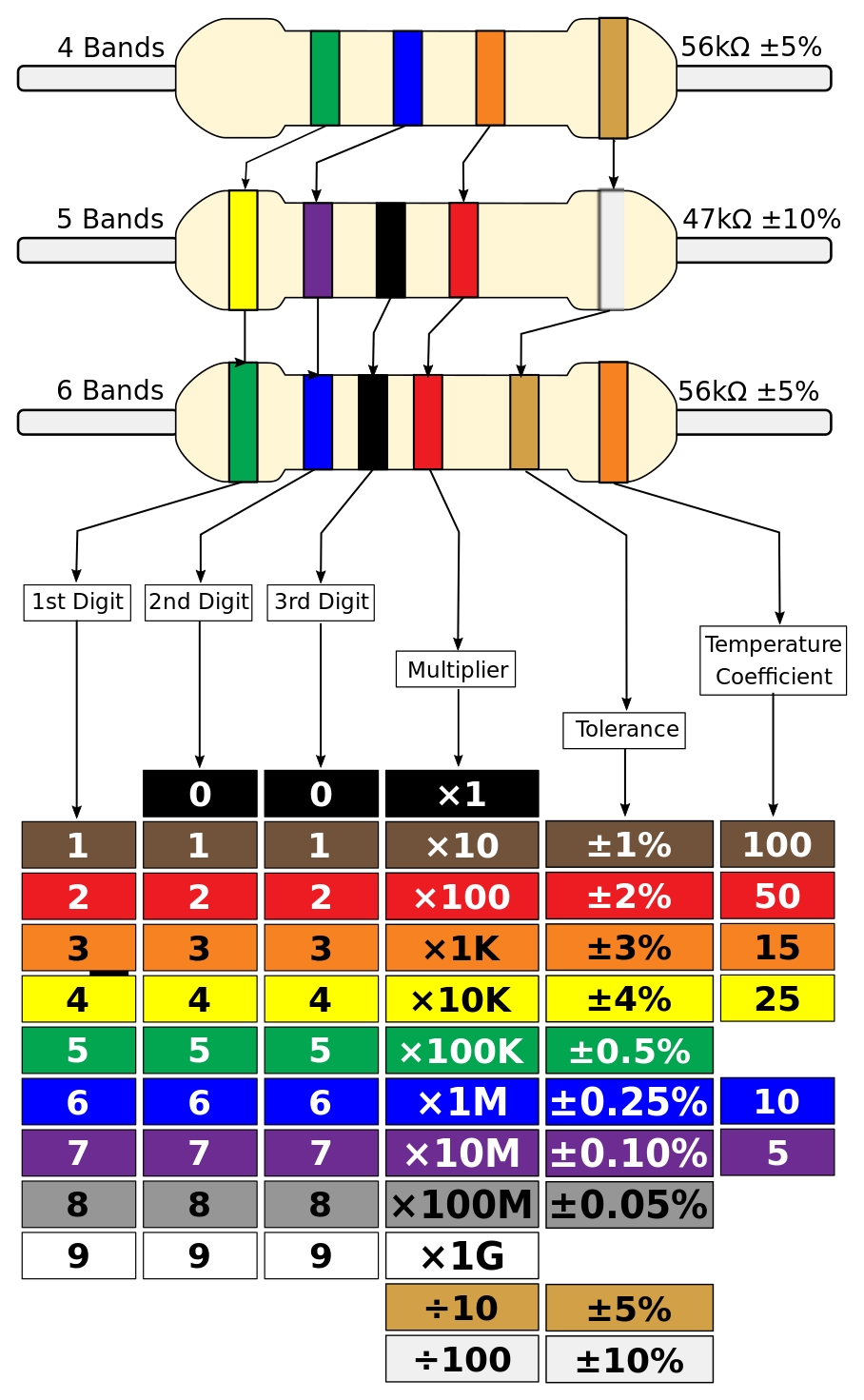 This is a diagram that shows the relationship between different colored resistors and their corresponding values. There are several types of resistors, each with its own unique color. These colors are connected by lines to indicate how they relate to one another in terms of resistance value. The chart is organized in such a way that it allows users to quickly identify the appropriate resistor for their needs based on the desired resistance value. This type of diagram can be particularly useful for those working with electronic circuits or other applications where precise control over electrical current and voltage is necessary.