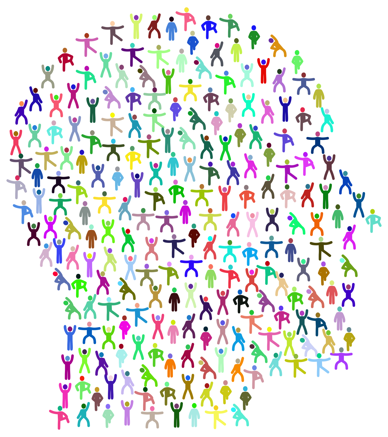 This features a large collection of people in various poses, all connected to each other. These individuals are depicted as yoga poses, with some standing and others sitting or lying down. They are arranged in such a way that they form the shape of a head, creating an interesting visual effect. The colors of these yoga poses vary, adding depth and interest to the overall composition. This unique representation of people as yoga poses showcases creativity and artistic expression.
