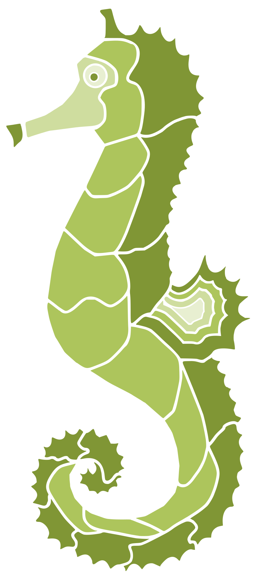 This features a green and white sea horse, which is an aquatic creature with a unique appearance. It has a long tail and a spiral-shaped body that resembles the shape of a shell. The sea horse's head is positioned at the top left corner of the image, giving it a sense of movement as if it were swimming in the water. This intriguing creature is depicted on a white background, which allows its vibrant colors to stand out and draw attention to its unique features.