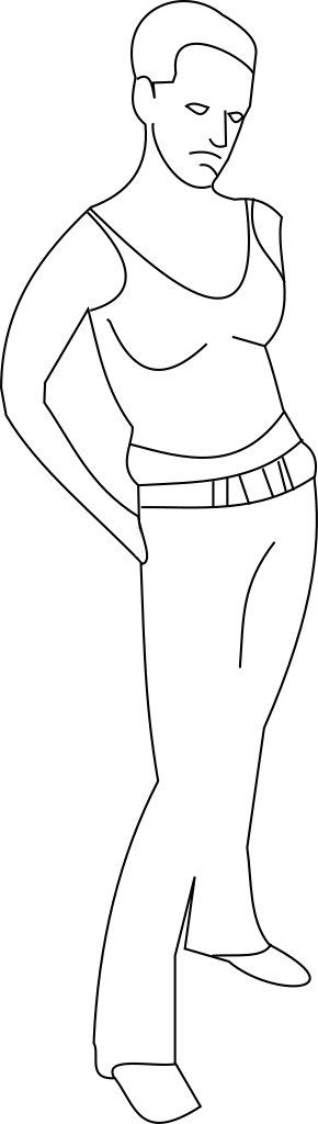 This features a woman standing in front of a brown wall. She is wearing tight clothing, including a tank top and pants that accentuate her figure. Her pose suggests confidence and poise as she stands with one hand on her hip. The overall scene appears to be a black and white drawing or sketch, giving it an artistic quality.