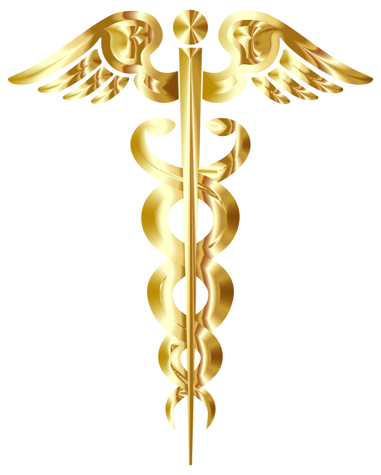 This features a golden caduceus, which is an emblem commonly associated with the medical profession. This particular caduceus has a glossy effect and is adorned with wings at the top, giving it a more ornate appearance. The gold color of the caduceus adds to its elegance and prominence in the image.
