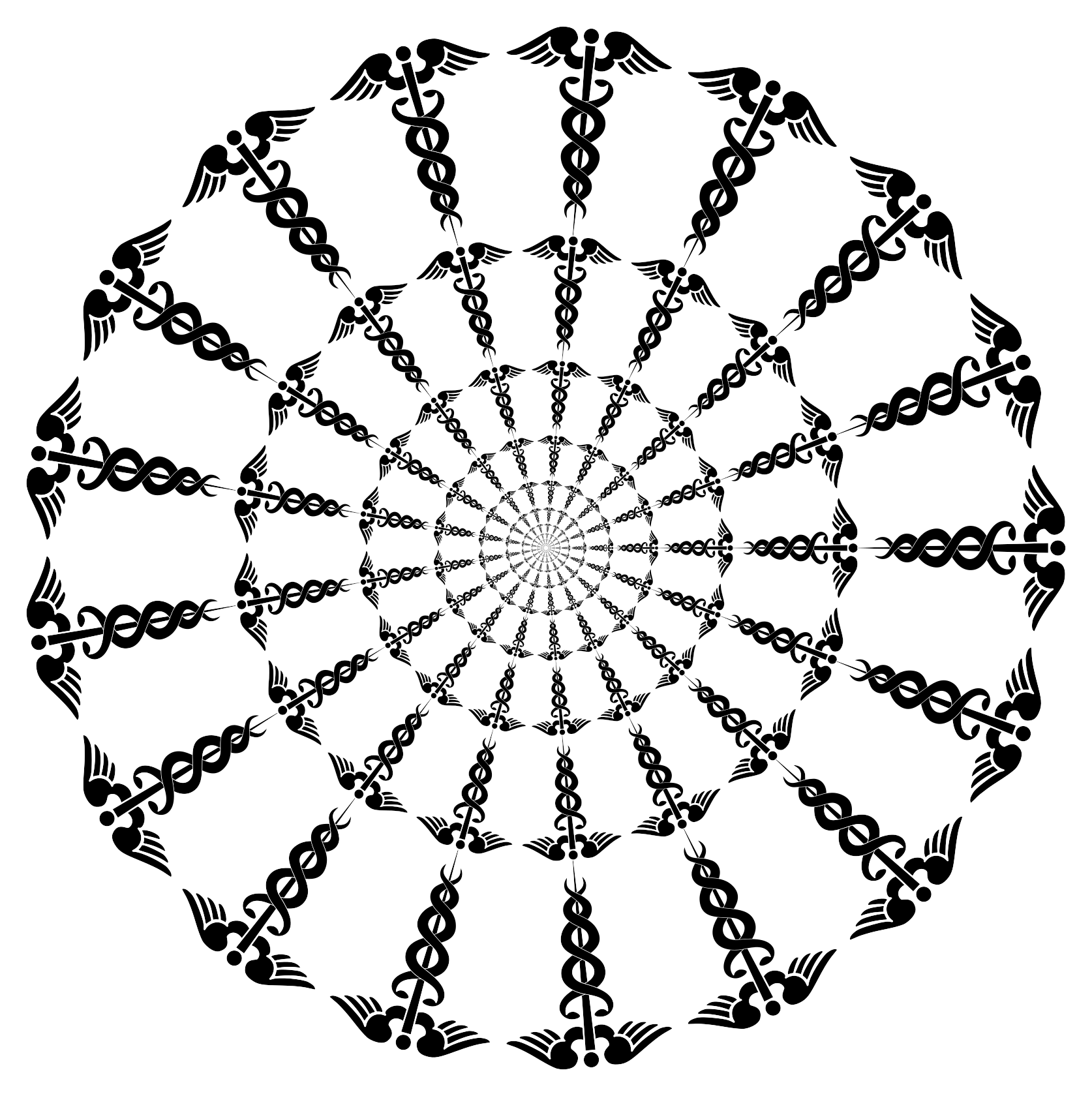 This features a large, intricate design that resembles a caduceus, which is an ancient symbol often associated with healing and medicine. This unique pattern is created by combining multiple smaller caduceus signs in various positions around the central circle of the design. The overall effect gives off a sense of depth and complexity, making it an interesting visual piece. The caduceus sign itself consists of two snakes intertwined with wings, representing the idea of transformation and renewal. This artistic representation of the caduceus is both captivating and thought-provoking.