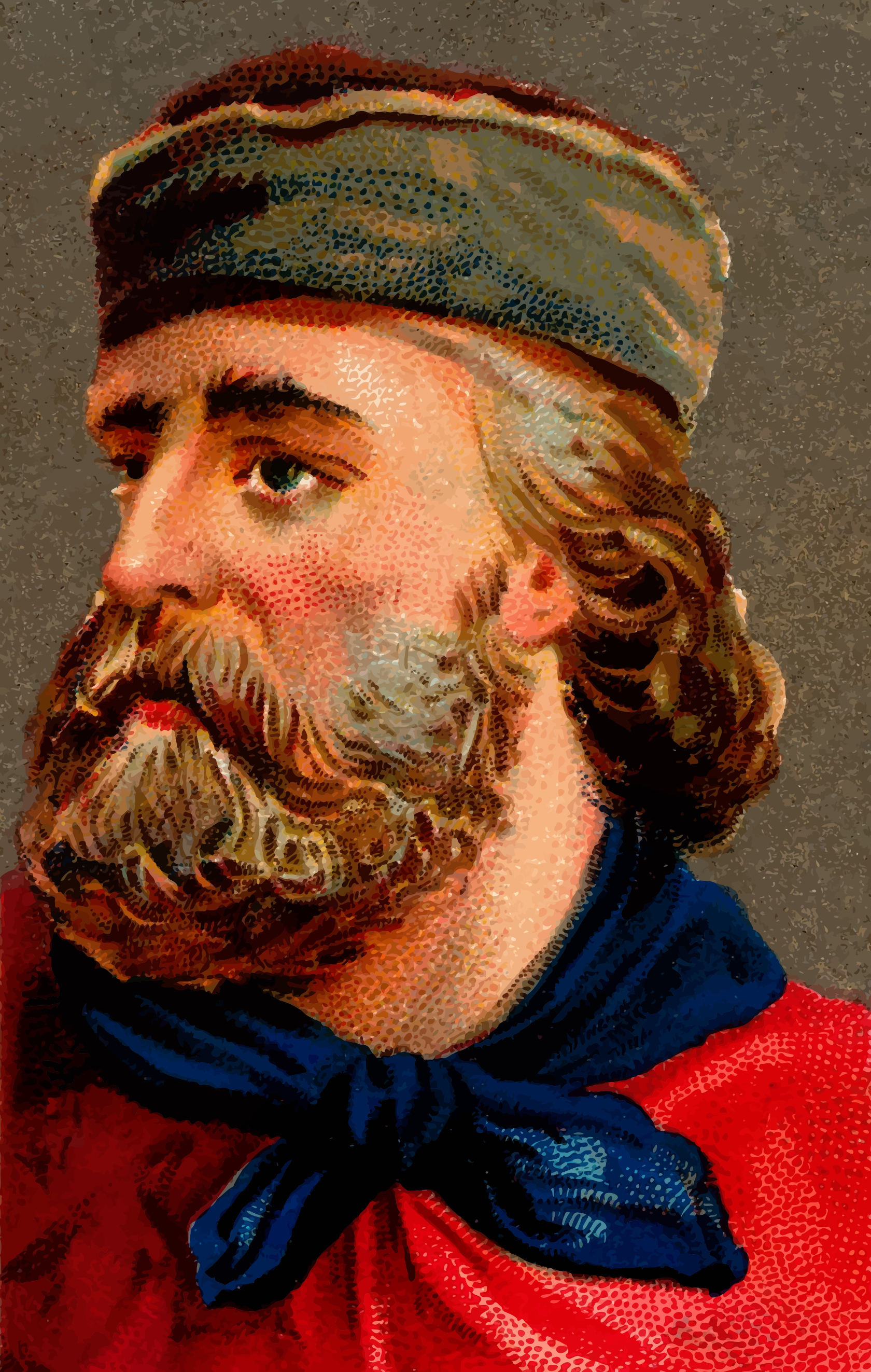 This features a man with a beard and mustache, wearing a red jacket. He is also wearing a blue bow tie around his neck. The man appears to be an older gentleman, possibly from the 18th century, as he is depicted in a painting or drawing. His attire suggests that he might have been a military officer during that time period. The image captures the essence of a bygone era and showcases the man's distinctive appearance with his beard and mustache.