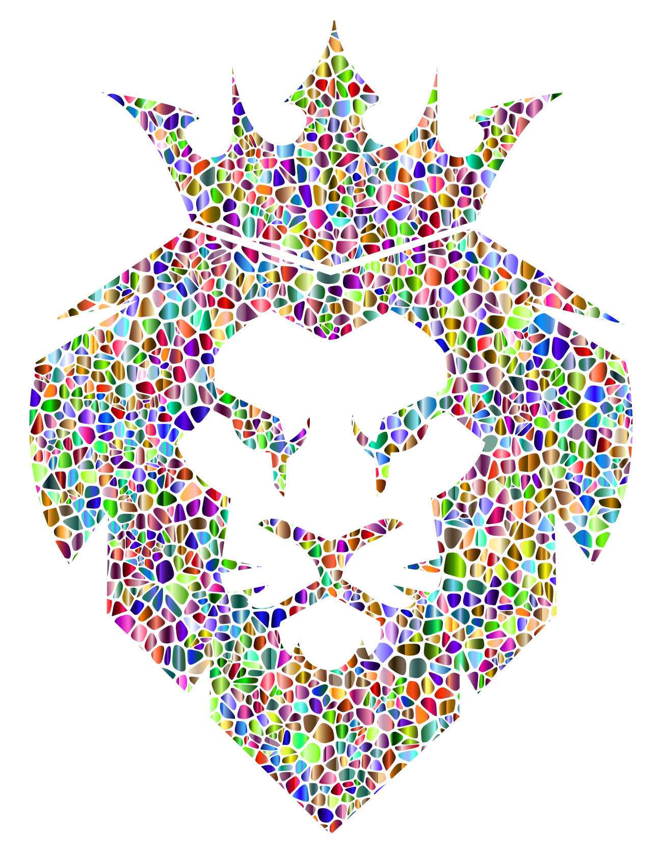 This features a lion's head with a crown on its head, surrounded by colorful dots. The lion appears to be wearing a white face mask and is adorned with a crown that adds an element of royalty to the scene. The dots surrounding the lion are scattered in various colors, creating a vibrant and eye-catching visual effect. This unique design could potentially be used as a decorative piece or even as part of a larger artwork.