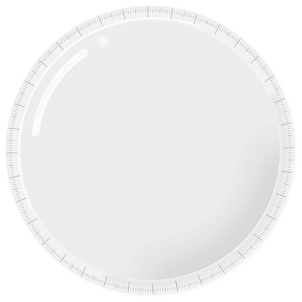 This features a round, white plastic ruler with a lens in the middle. It is placed on a table and appears to be made of clear material. The ruler has several measurements marked on it, including 10, 20, 30, 40, and 50 centimeters. This versatile tool can be used for various purposes such as measuring distances or determining the size of objects.