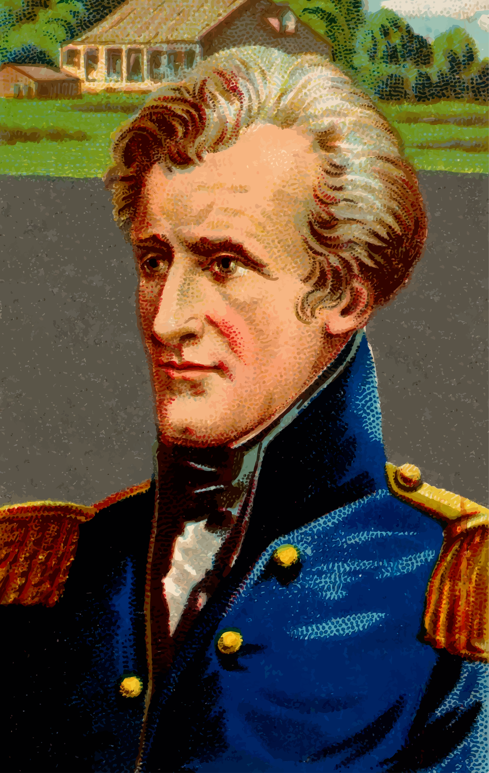 This features a man dressed in a blue military uniform, possibly an admiral or general. He is wearing a black tie and has a stern expression on his face. The man appears to be looking directly at the viewer with a sense of authority. In the background, there are two houses visible, one located behind the other. This scene could represent a historical moment or a portrait of an important military figure.