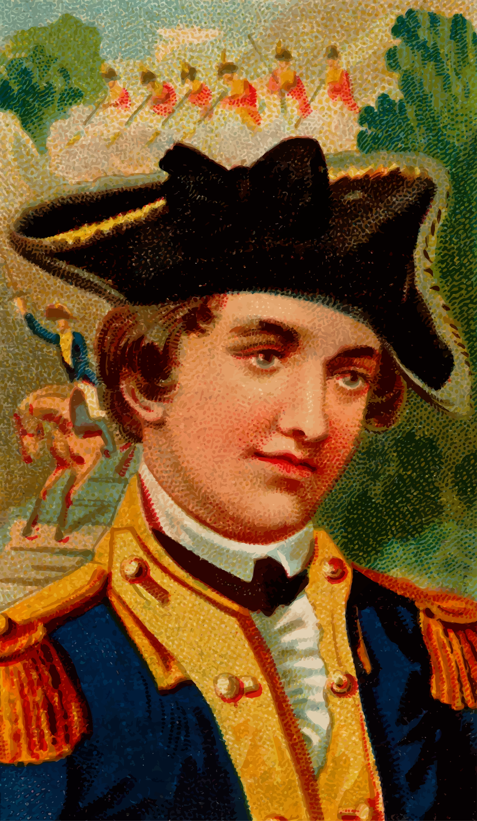 This features a man dressed in military garb, wearing a blue coat and a yellow vest. He is adorned with a black hat and has a goatee. The man appears to be staring at the camera, possibly posing for a portrait. In the background, there are several horses visible, suggesting that this might have been taken in a historical setting or during a military event.