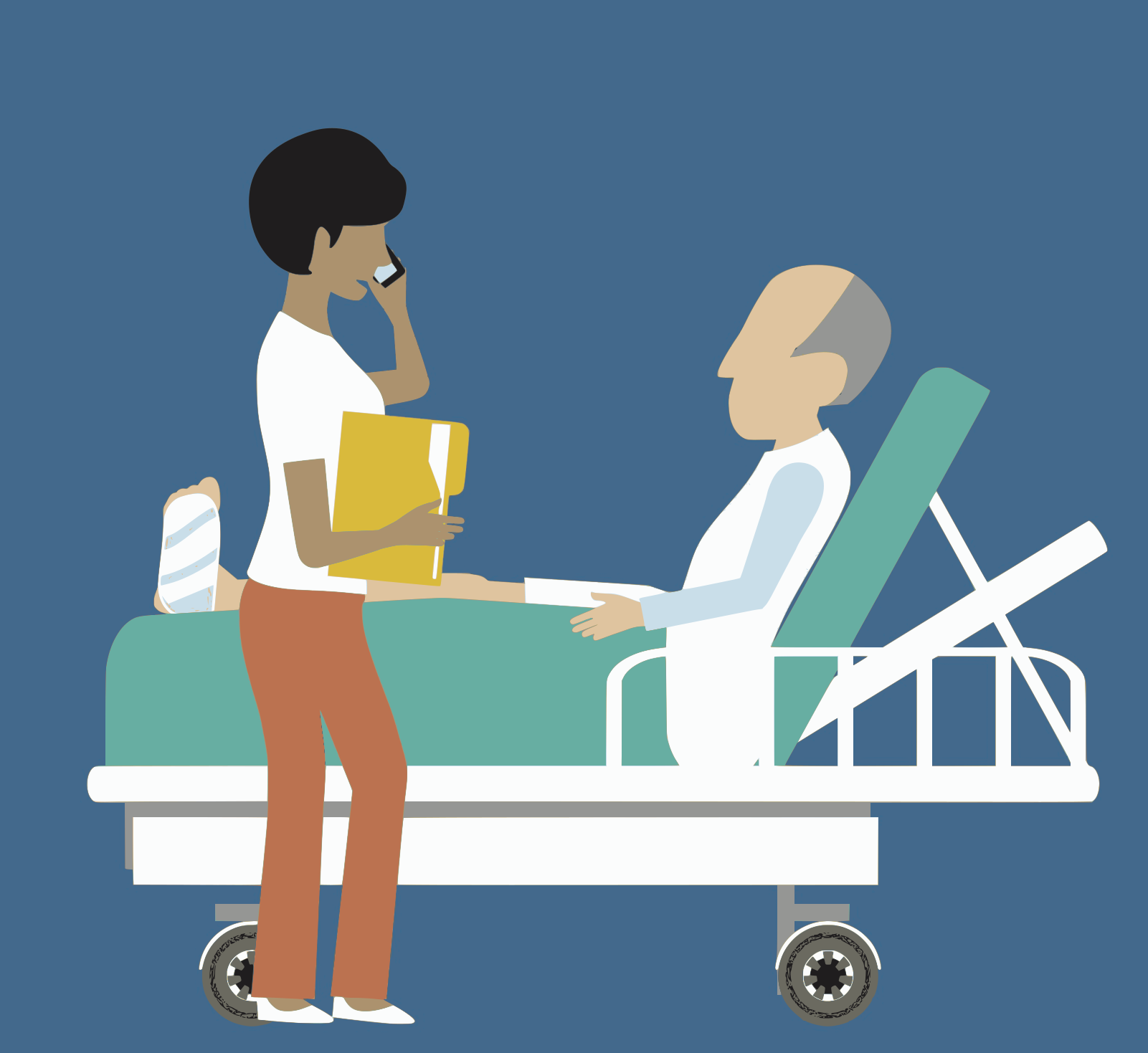 This features a woman standing next to an older man who is sitting in a hospital bed. She appears to be talking on her cell phone while the man looks at her with concern. They are both positioned near a chair, which can be seen in the background. A book is also visible in the scene, placed close to the woman and the man. The overall atmosphere of the image suggests that they might be discussing or sharing information about the older man's health situation.