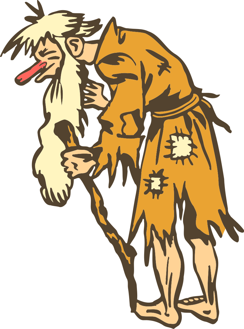 This features a colorful cartoon drawing of an old man wearing a brown robe. He is holding a walking stick in his hand and appears to be leaning on it for support. The man's face has a funny expression, adding humor to the scene. The overall atmosphere of the image suggests that it could be from a children's book or a comic strip.