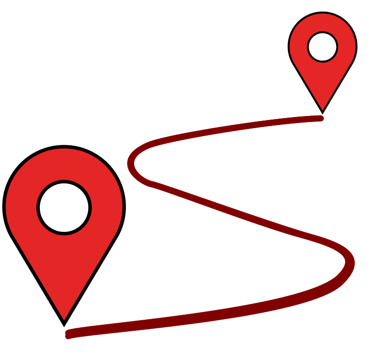 This features a red and white map with two red pinpoints, one on the left side and another on the right. A red line connects these two points, indicating a route between them. In addition to the pinpoints and line, there are two small arrows pointing in opposite directions, suggesting that this is an A-to-B map routing system. The overall design of the image gives off a sense of directional guidance for travelers or commuters.