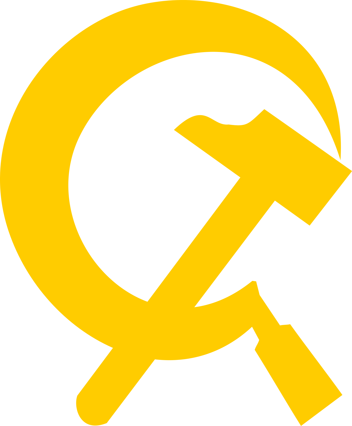 This features a yellow and red hammer and sickle logo, which is the symbol of communism. This iconic emblem is prominently displayed in the center of the picture, with its bold colors making it stand out against the background. The combination of yellow and red gives the logo a striking appearance, drawing attention to its significance as a representation of communist ideals.