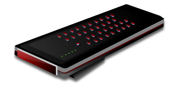 This features a small, black and red remote control with a keyboard on top. It is placed on a table or countertop, taking up most of the space in the frame. The remote control has multiple buttons arranged across its surface, making it suitable for various functions. The combination of black and red colors gives the device an attractive appearance, while the keyboard adds a unique touch to its design.