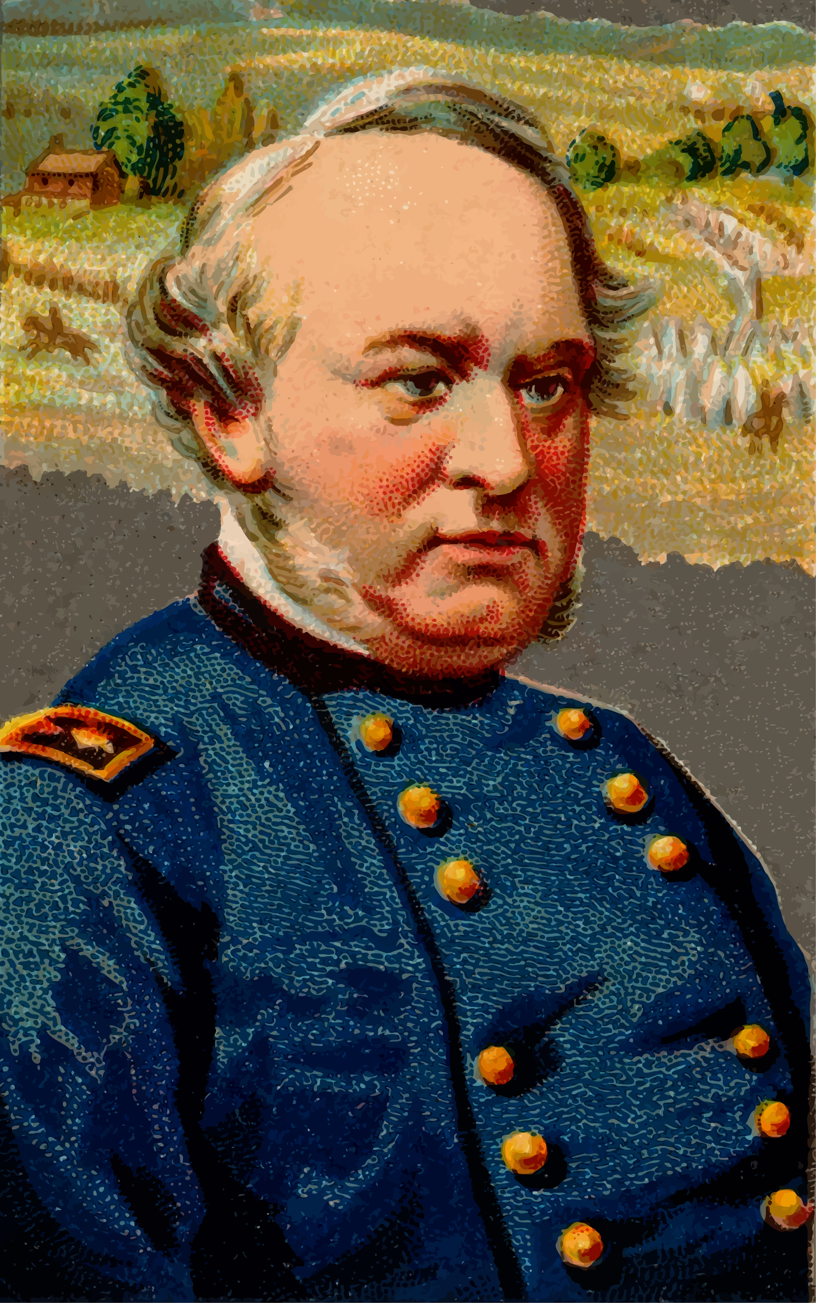 This features a man dressed in military attire, wearing a blue uniform with gold buttons. He is staring directly at the camera, giving off an intense and serious vibe. The man appears to be of older age, possibly a general or a high-ranking officer. In the background, there are several sheep scattered around, adding a touch of nature to the scene. Overall, the image captures a moment in time with a strong sense of authority and leadership.