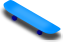 This features a blue skateboard with four wheels, sitting on top of a white surface. The skateboard is positioned in such a way that it appears to be almost entirely off the ground, giving an impression of being suspended or floating. This unique perspective adds an interesting visual element to the scene.