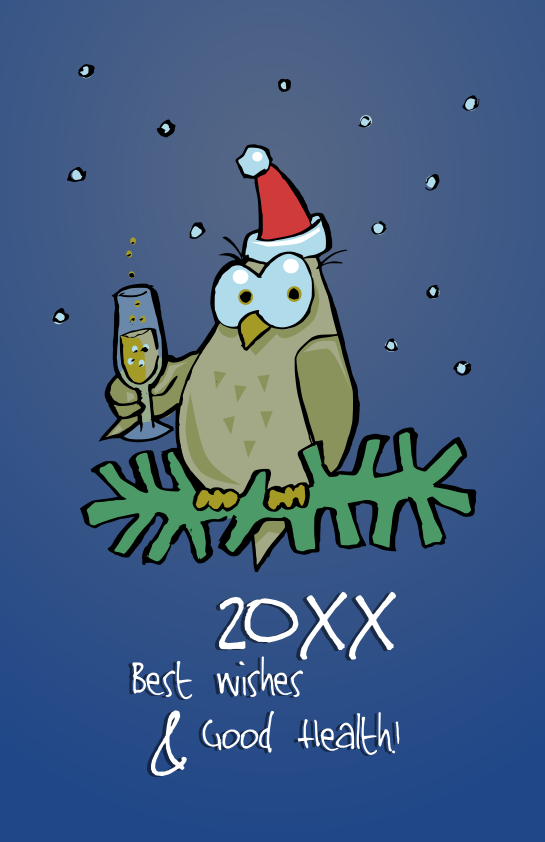 This features a cartoon bird sitting on top of a branch, holding a glass of wine. It appears to be enjoying the drink while looking at the camera. The bird is wearing a Santa hat, adding a festive touch to the scene. In addition to the main bird, there are two smaller birds in the background, one located near the left edge and another towards the right side of the image. The overall atmosphere suggests a cozy and cheerful holiday setting.