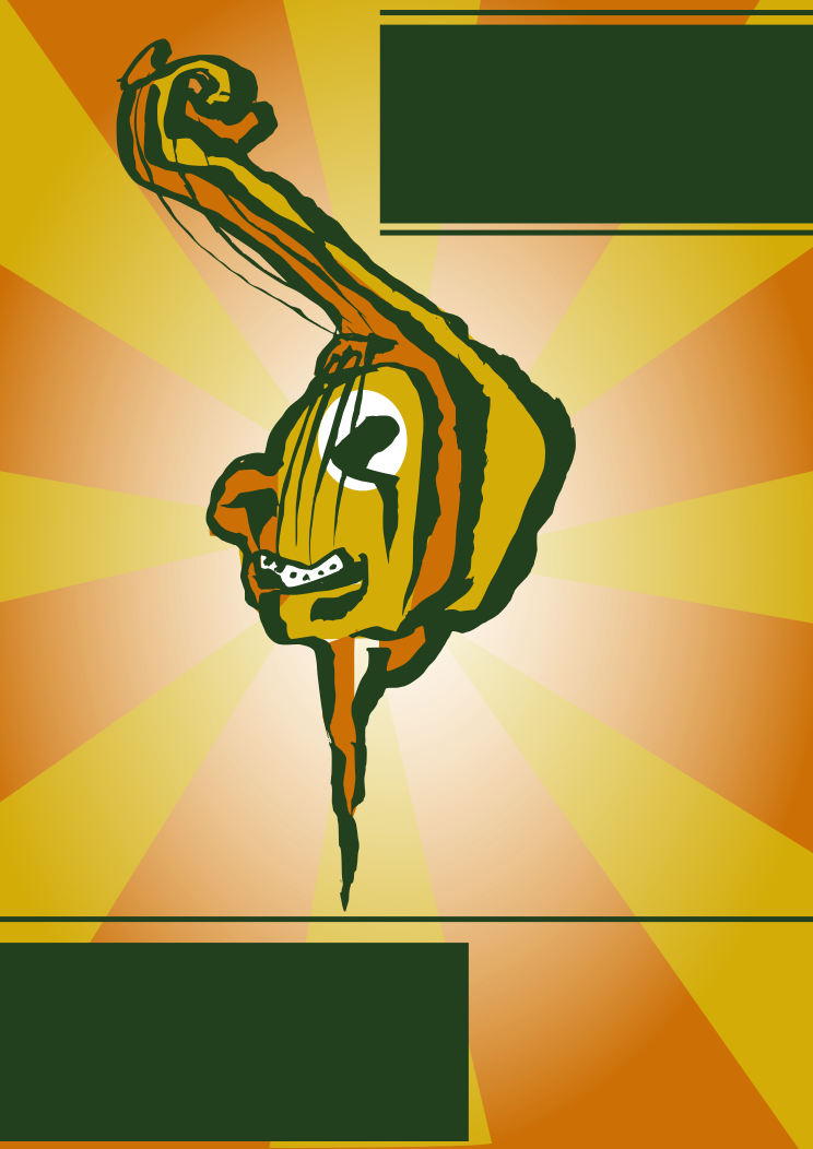 This features a yellow and black drawing of an instrument, possibly a guitar or a violin. It is positioned in the center of the frame with its neck stretching outwards towards the top right corner. The drawing appears to be somewhat distorted, giving it a unique and artistic appearance. The overall composition of the image creates a visually interesting focal point that draws attention to the creative design.