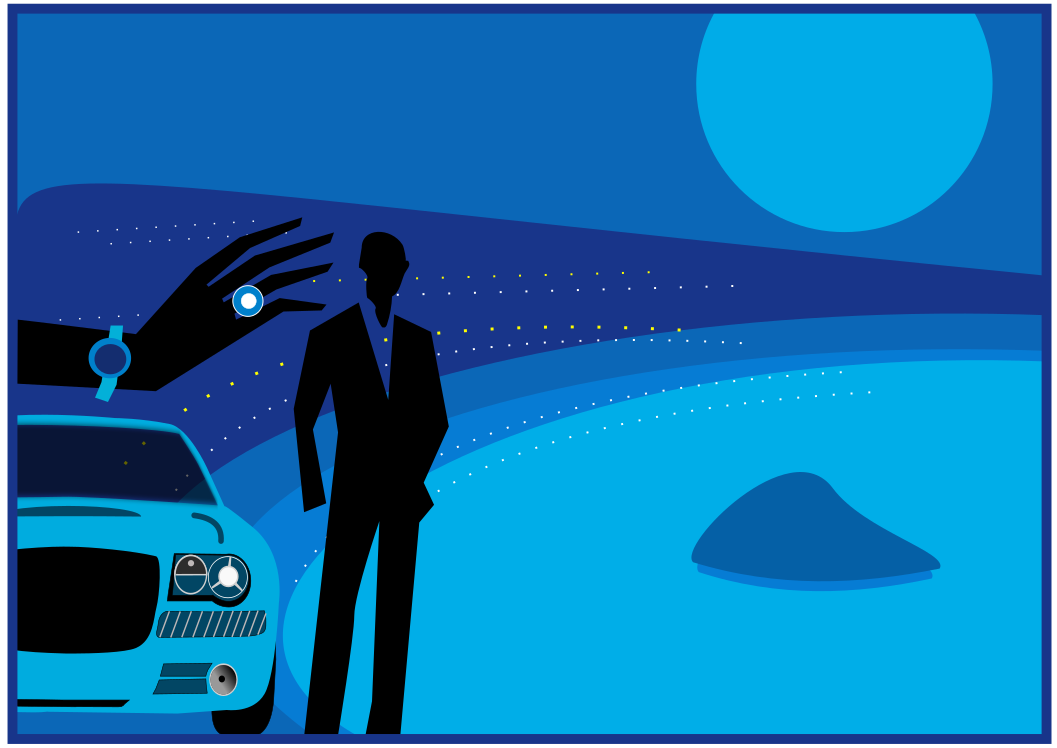 This features a man standing next to a blue car, possibly admiring it. He is wearing a suit and tie, giving the impression of being well-dressed for an event or occasion. In his hand, he holds a cell phone, which could be used for communication or capturing memories of the moment. The scene takes place in front of a beach setting with sand visible on the ground. Additionally, there is another person standing further away from the main subject, possibly observing the man and the car as well.