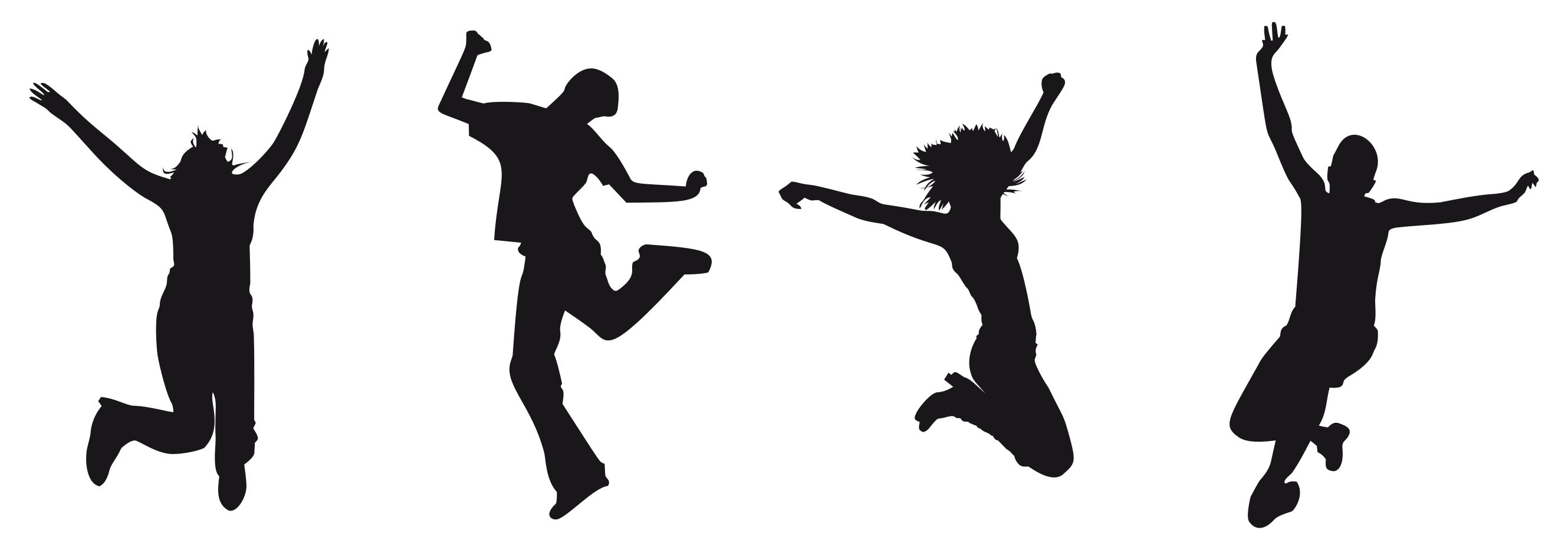 This features a group of five silhouettes of people jumping in the air, all with their arms raised. They are positioned at various heights and angles, creating an interesting visual effect. Each person's silhouette is distinct from one another, showcasing different body shapes and sizes. The scene appears to be a lively celebration or gathering where everyone is enjoying themselves by jumping in the air together.