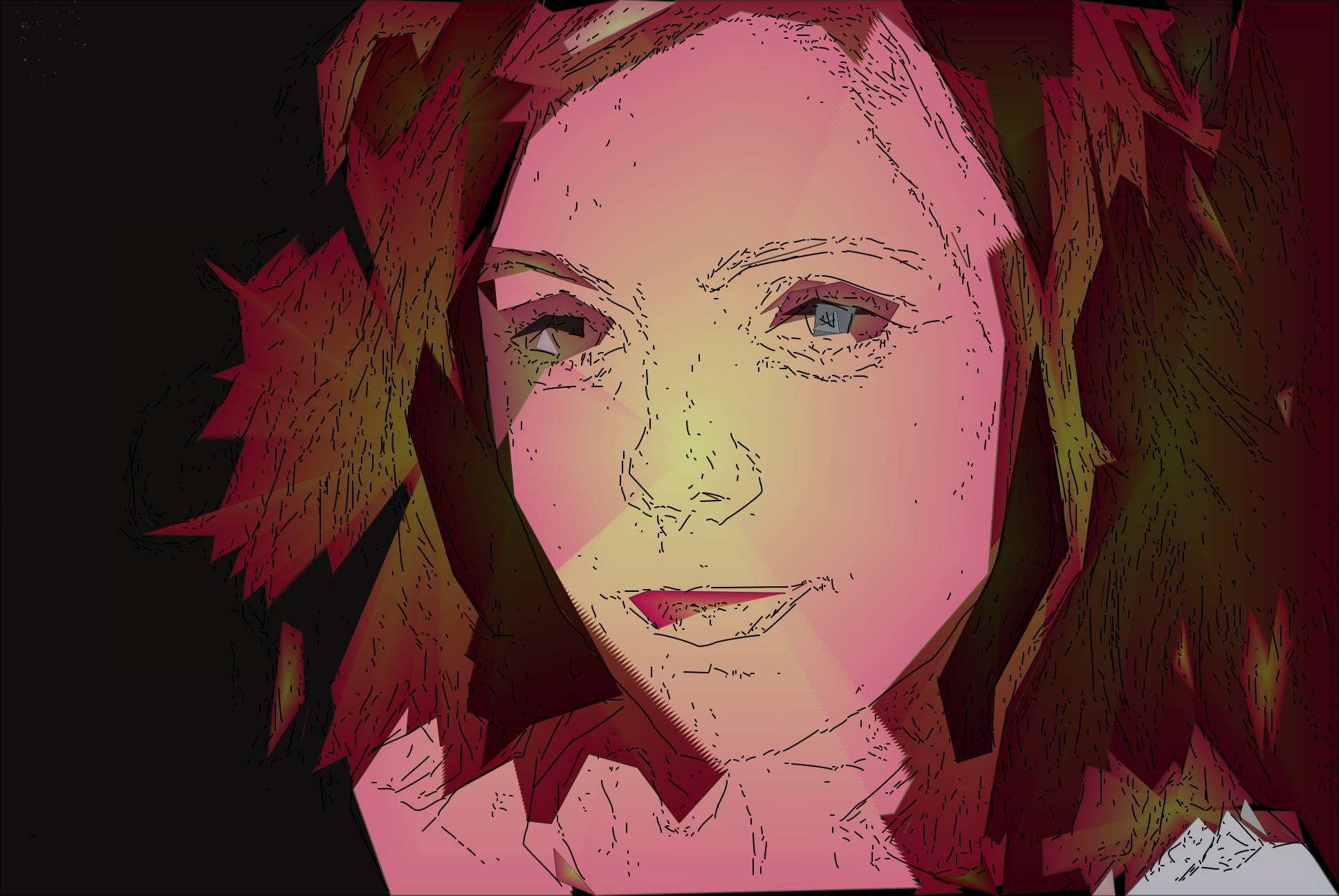 This is a colorful drawing of a woman's face and hair. She has light peach skin, brown hair, and blue eyes. Her lips are painted red, adding a pop of color to the picture. The drawing captures her facial features in detail, including her nose, mouth, and eyebrows. The overall effect is an artistic representation of the woman's appearance that stands out with its vibrant colors and intricate details.