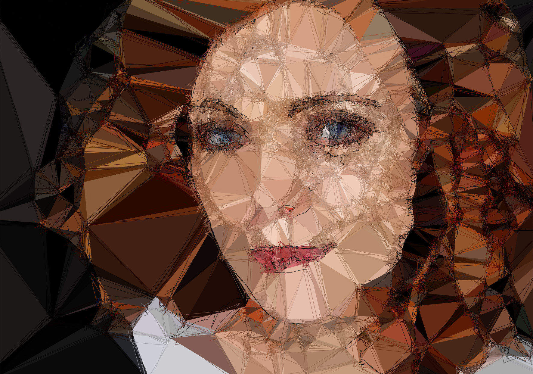This features a woman with red hair, her face is the main focus of the picture. She has blue eyes and appears to be looking directly at the camera. Her facial features are intricately detailed in a 3D graphic style, giving the impression that she's made up of many small pieces. The woman's hair is also depicted in a similar manner, with each strand being represented by a separate piece. This artistic representation creates an interesting and unique visual effect.