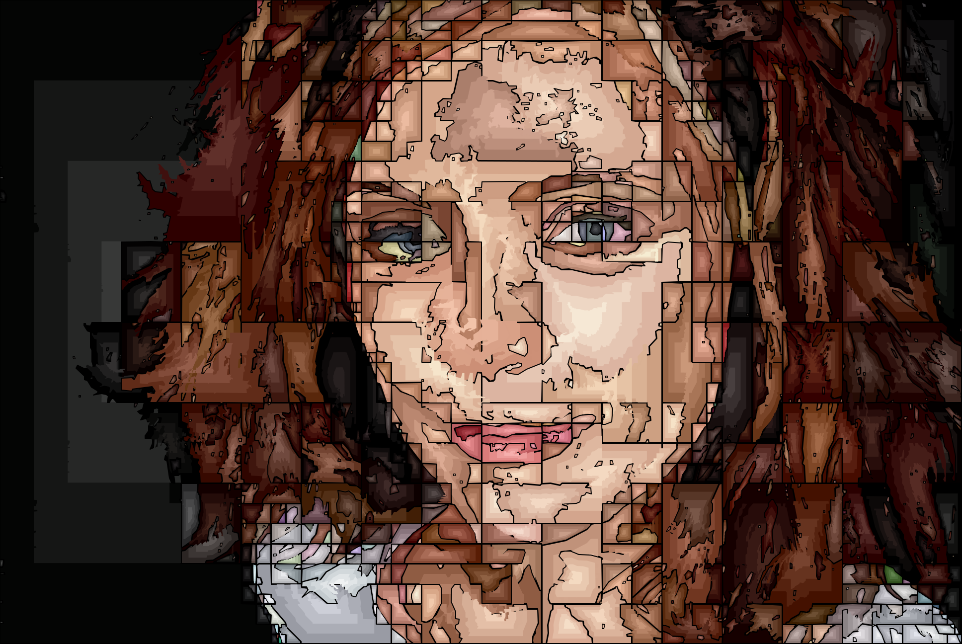 This features a woman with red hair, wearing glasses and a white shirt. She has a smiling expression on her face as she poses for the camera. Her eyes are open wide, giving off an impression of being happy or excited about something. The photo is in black and white, adding to its artistic quality. The woman's hair appears to be styled in a way that makes it look like a painting, further emphasizing the artistic nature of the image.