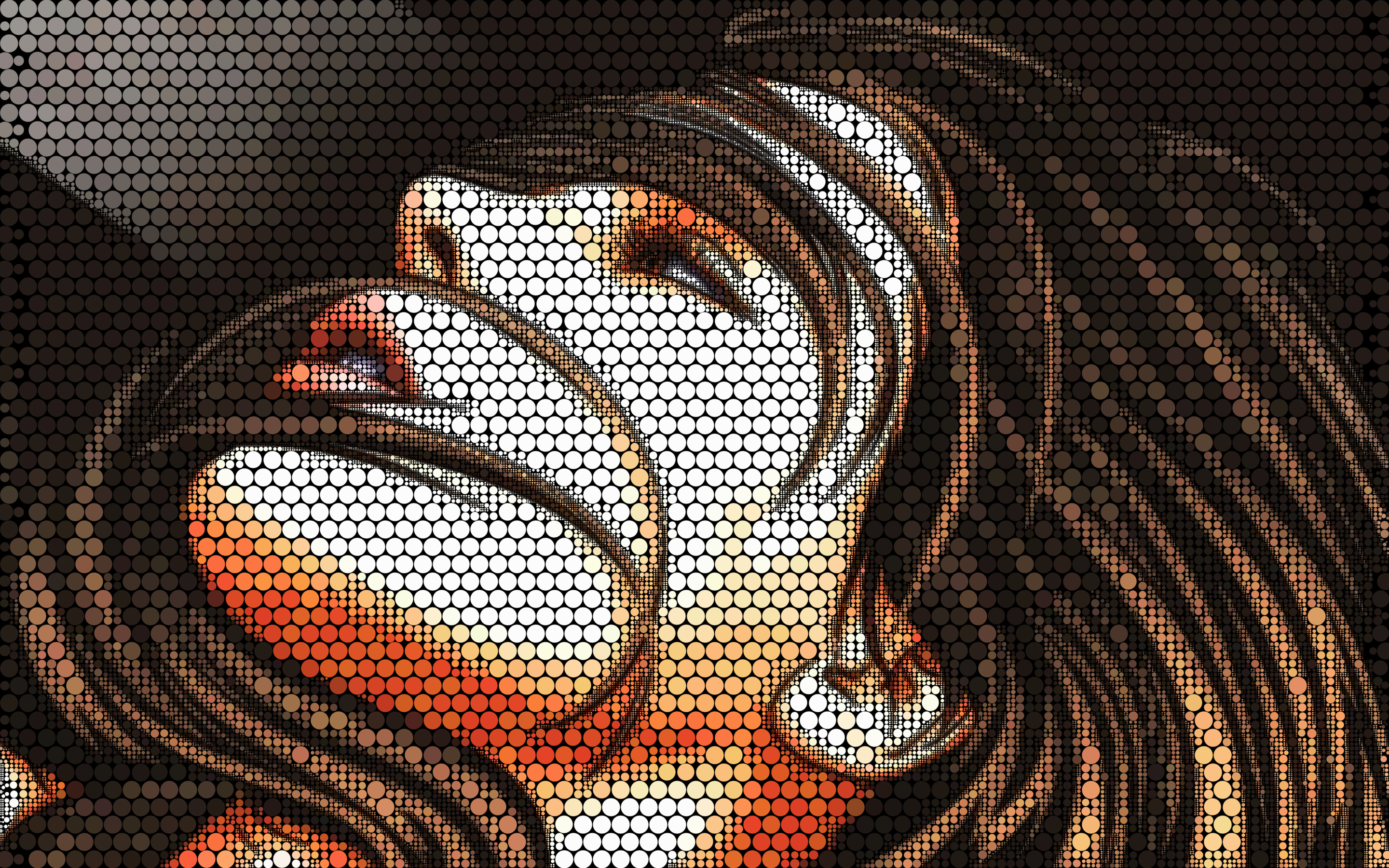 This features a woman with long brown hair, her face covered by her hair. She appears to be looking upwards and has a somewhat sad expression on her face. The image is made out of pixels, giving it a unique and artistic appearance.