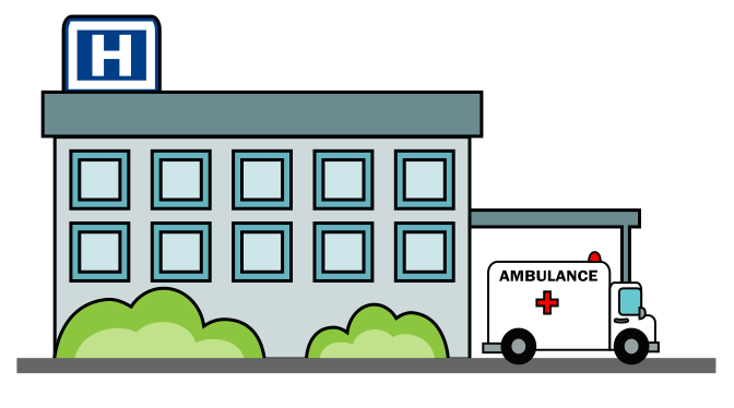 This features a large hospital building with a blue and white sign on top, indicating it is an emergency medical facility. In front of the hospital, there is a parked ambulance vehicle, ready to respond to any emergencies that may arise. The scene also includes several trees surrounding the hospital, adding some greenery to the area. Overall, this image portrays a well-equipped and prepared healthcare facility for emergency situations.