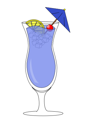 This features a colorful cocktail in a tall glass, which is adorned with an umbrella. The drink appears to be a refreshing and fruity concoction, possibly an Aqua Velva, as it contains vodka, gin, lemon-lime, and Blue Curaçao. The combination of these ingredients creates a visually appealing and appetizing presentation. The umbrella adds a playful touch to the drink, making it look like a tropical vacation in a glass.