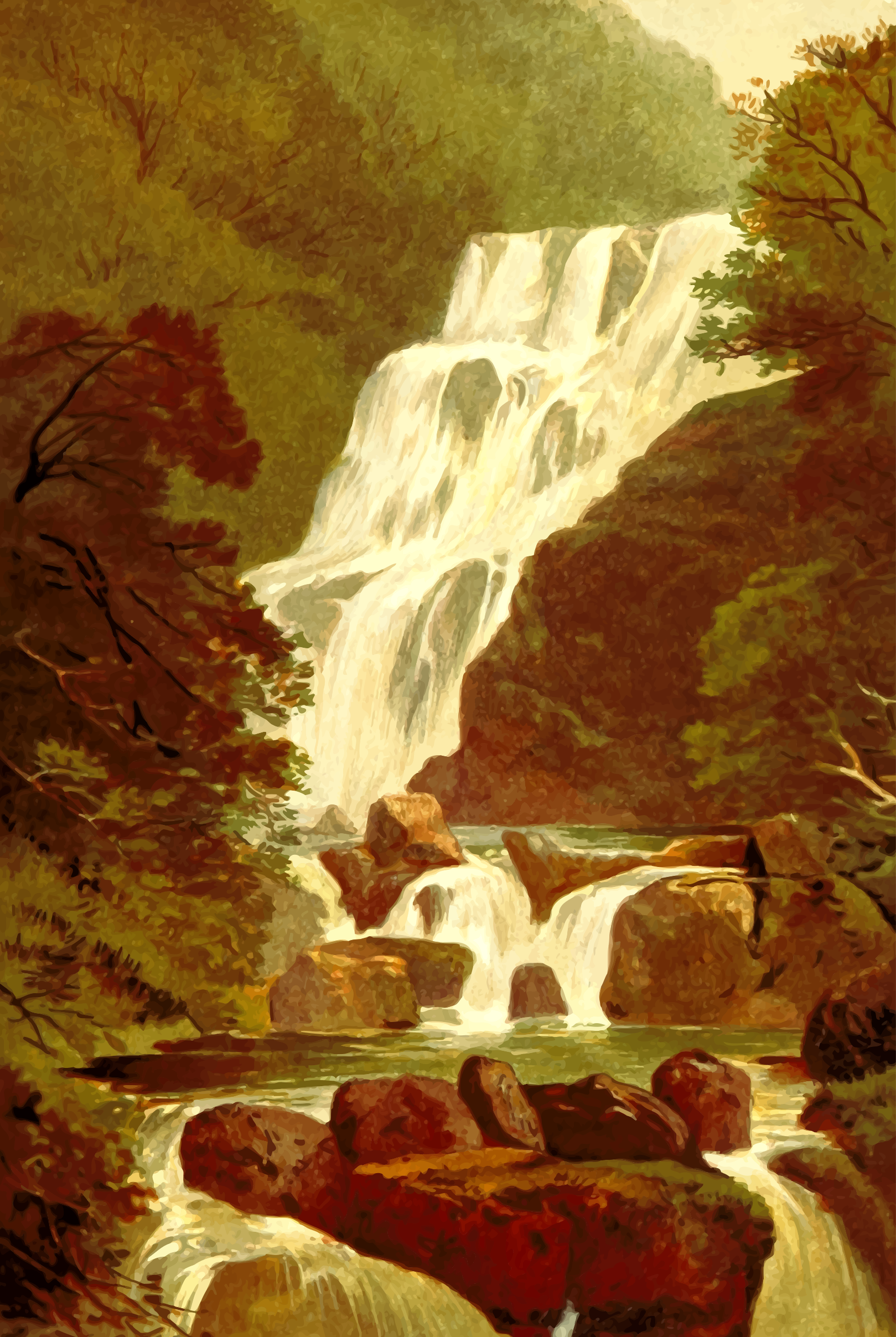 This features a beautiful waterfall surrounded by lush green trees. The waterfall is located in the middle of a forest, and it appears to be cascading down from a cliff. There are several rocks scattered around the area, adding to the natural scenery. A river can also be seen flowing through the forest, creating a serene atmosphere. This painting captures the essence of nature's beauty with its vibrant colors and intricate details.
