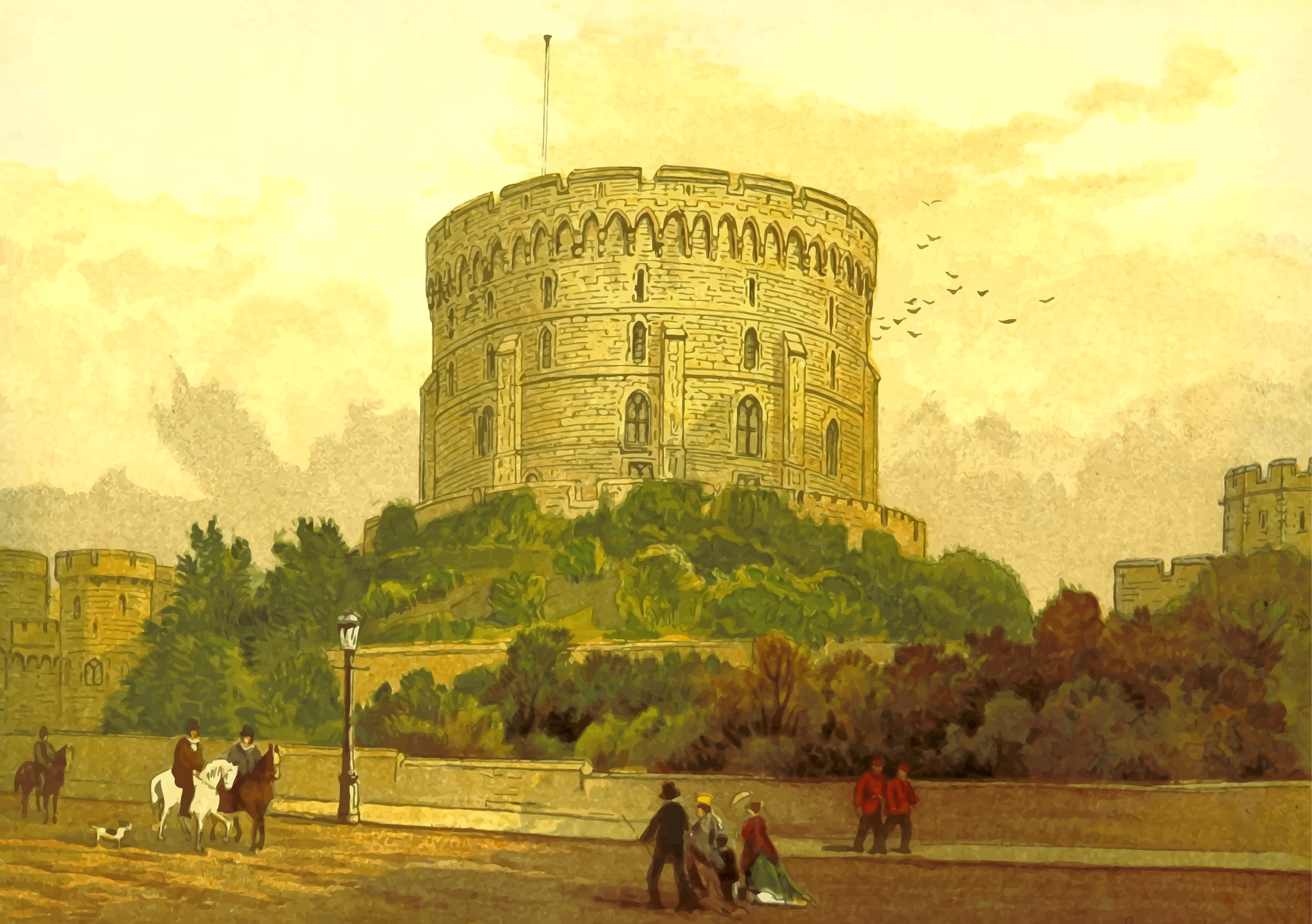 This features a large, old castle with a tall tower in the background. It is situated on top of a hill and overlooks a town below. A group of people can be seen walking around the area, some closer to the castle while others are further away. There are also several birds flying above the scene, adding life to the image. In addition to the people and birds, there is a horse in the foreground on the left side of the picture. A dog is also present near the bottom left corner of the image. The overall atmosphere suggests that this castle may be a popular tourist attraction or a historical site worth visiting.
