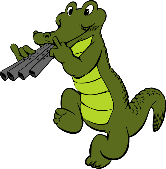 This features a cartoon crocodile with green scales, standing on its back legs and holding an instrument in its mouth. It appears to be playing the flute while making a funny face. The crocodile's body is large and occupies most of the frame, giving it a prominent presence in the scene. Its playful demeanor adds a lighthearted touch to the image, showcasing the creativity behind cartoon characters.