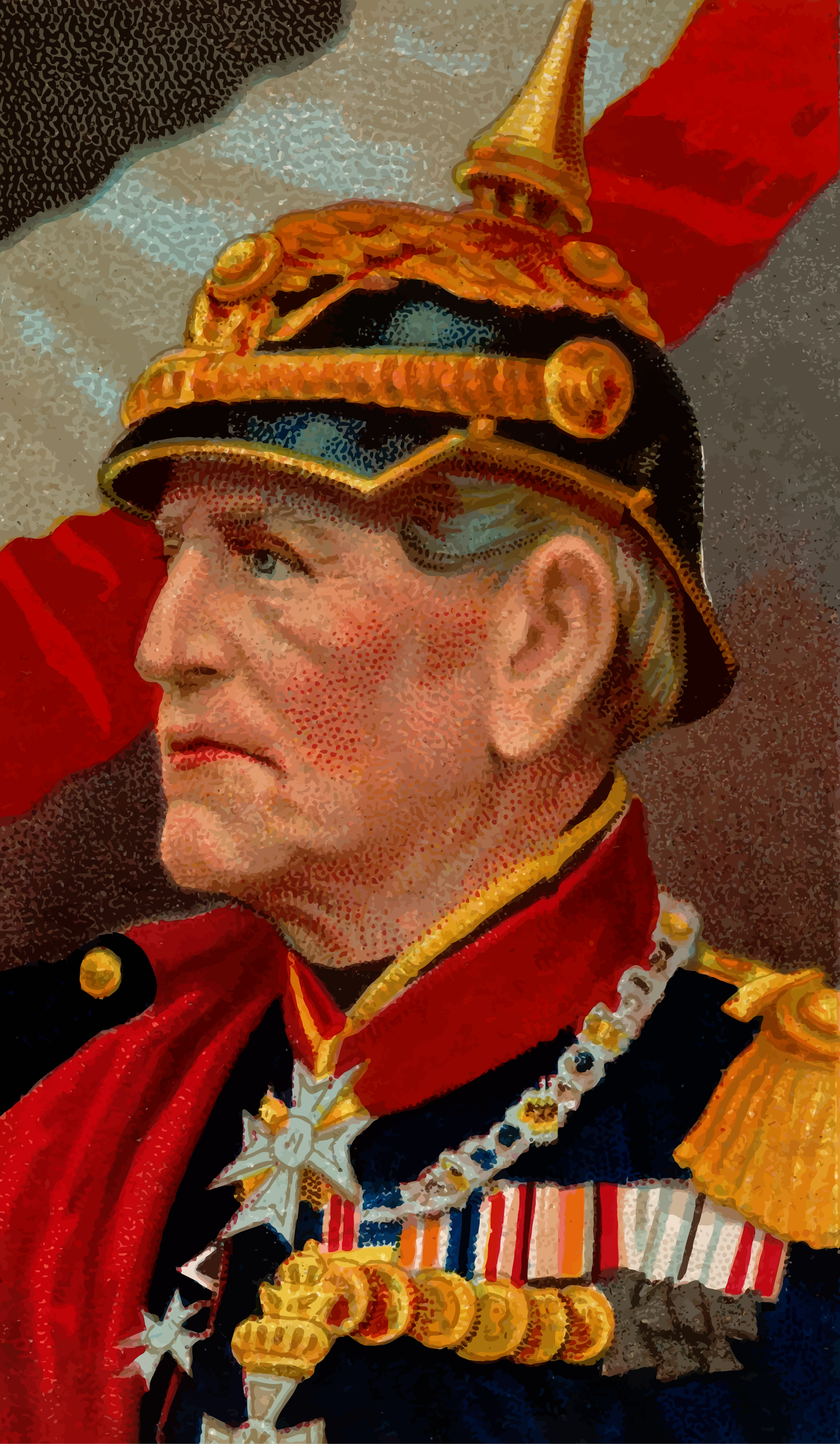 This features a man wearing a military uniform, adorned with various medals and decorations. He is dressed in a red coat and has a gold helmet on his head. The man appears to be an older gentleman, possibly a veteran or a retired soldier. His attire suggests that he holds significant rank within the military, as evidenced by the numerous awards and decorations he wears. The image captures a moment of pride and honor for this distinguished individual.