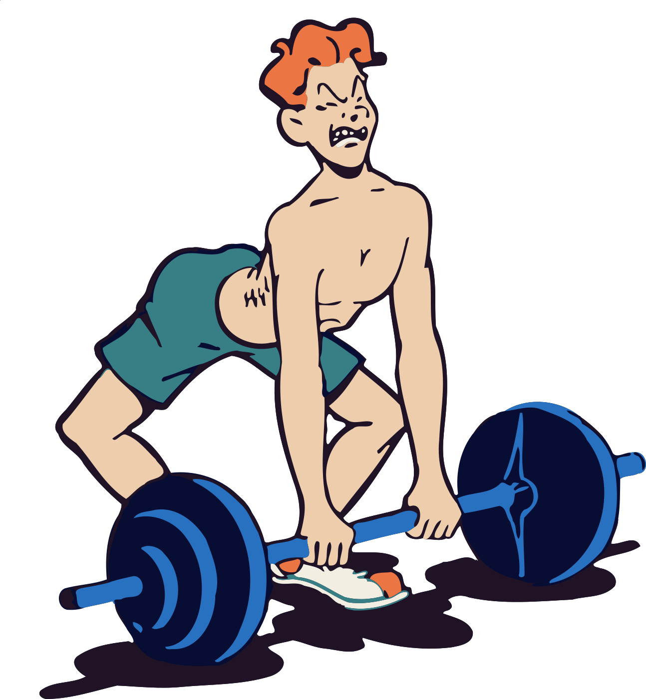 This features a man in the process of lifting weights. He is wearing green shorts and has orange hair, giving him an unconventional appearance. The man appears to be straining as he tries to lift the weight, showcasing his determination and strength.