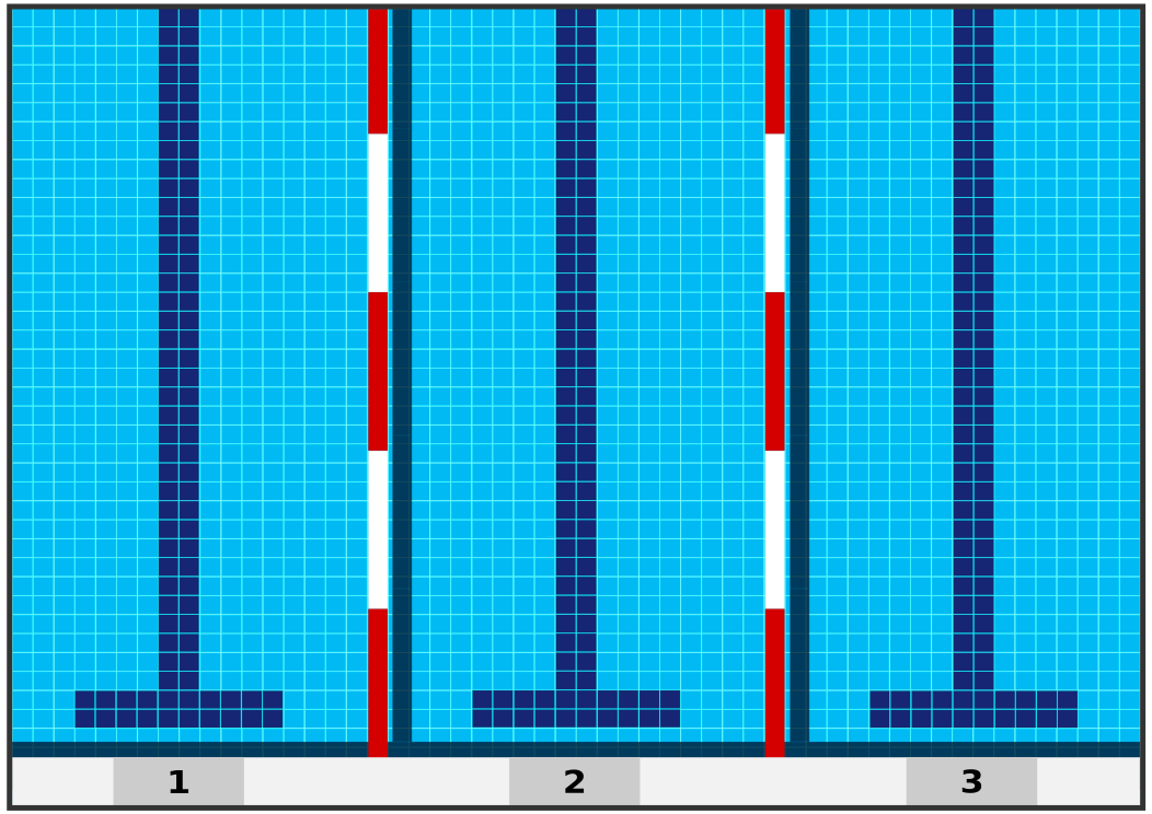 This features a blue grid with red and white stripes, which is likely used for measuring or counting. There are three sets of the grid displayed in the picture, each set consisting of four rows. Each row has a number on it, indicating that this could be a tool for counting or measuring specific quantities. The grid appears to be a simple yet effective way to keep track of numbers and measurements.