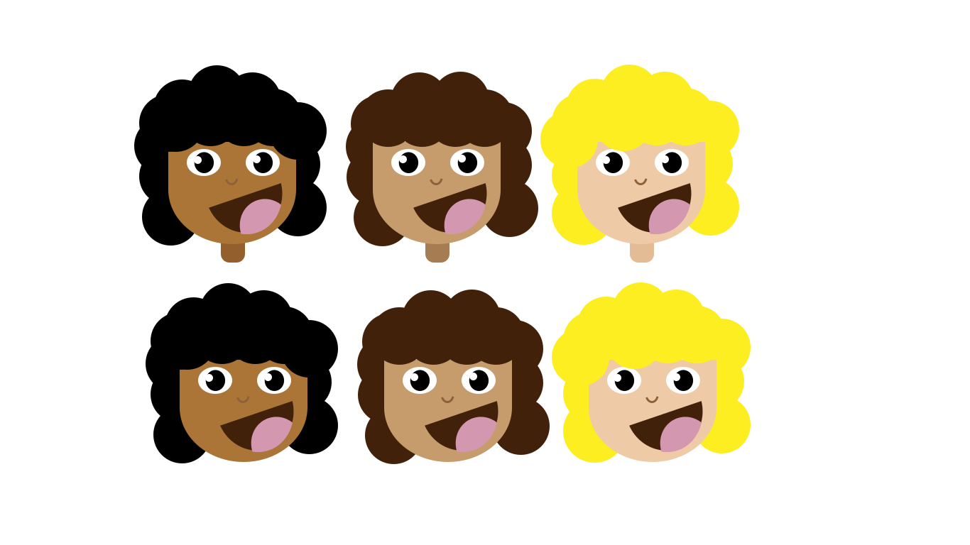 This features a series of six different colored female heads, each with distinct hair colors. They are all smiling and appear to be posing for the camera. Each head is accompanied by a corresponding colorful background that complements their respective hair color. This creative arrangement showcases the diversity in appearance while maintaining a cohesive theme throughout the image.
